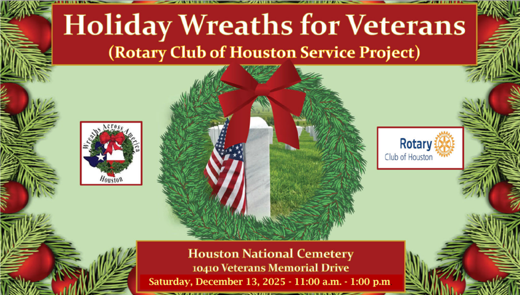 Please join members and friends of The Rotary Club of Houston as we participate in our annual “Holiday Wreaths for Veterans” service project on Saturday, December 13, 2025 from 11:00 am to 1:00 pm. For the sixth year now, The Rotary Club of Houston has partnered with “Wreaths Across America-Houston” to place holiday wreaths on the headstones of our fallen veterans at Houston National Cemetery—located at 10410 Veterans Memorial Drive, Houston, TX 77038. Once again, we are honored to join forces with our fellow Rotarians from across Rotary District 5890. We will be meeting by the flag poles adjacent to the “Veterans Circle” which is marked by a red arrow on the attached map.
